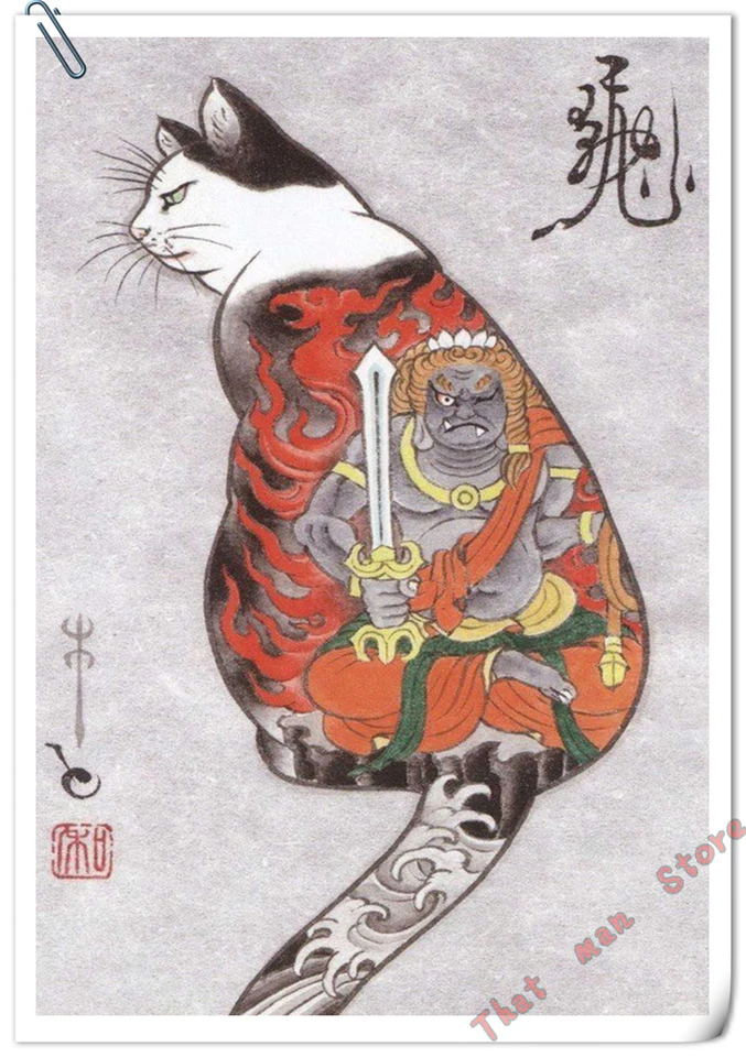 Vintage Paper Retro Anime Poster Japanese Samurai Cat Tattoo Cat